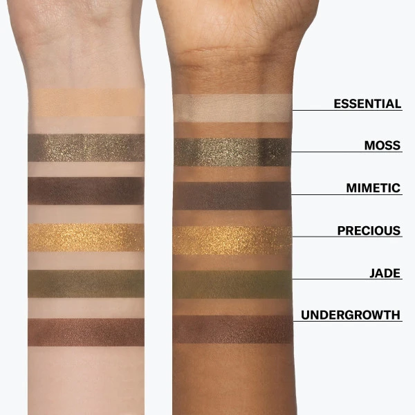 Palette Bare Harmony 205 Hidden Green de Mesauda Milano. 6 ombres à paupières de couleurs chaudes aux nuances de verts alliant des teintes mates et nacrés à la texture crémeuse et fondante pour une application facile et sans chute de pigment. Cette palette conviendra parfaitement à toutes les carnations et idéale pour créer des looks audacieux.